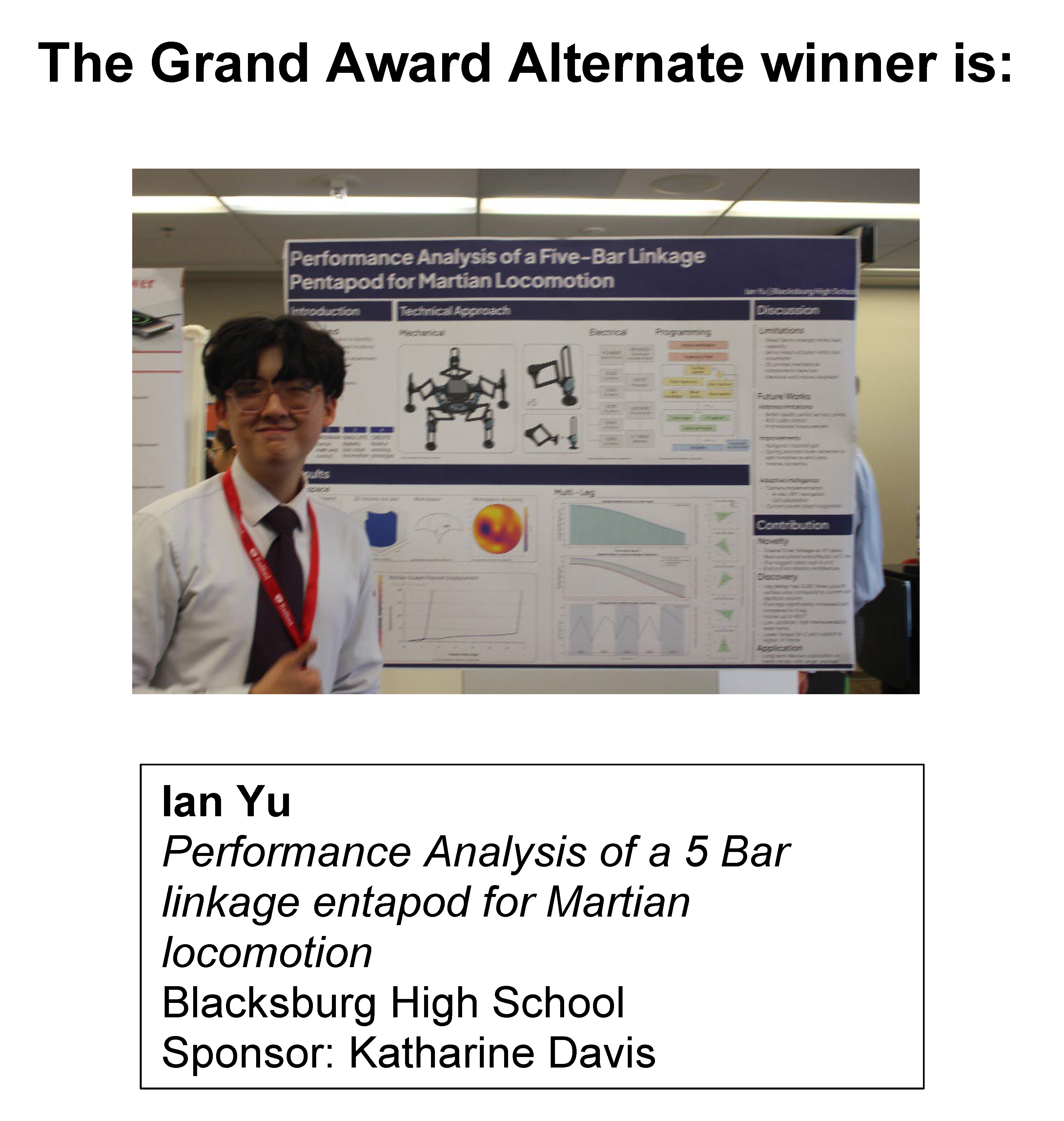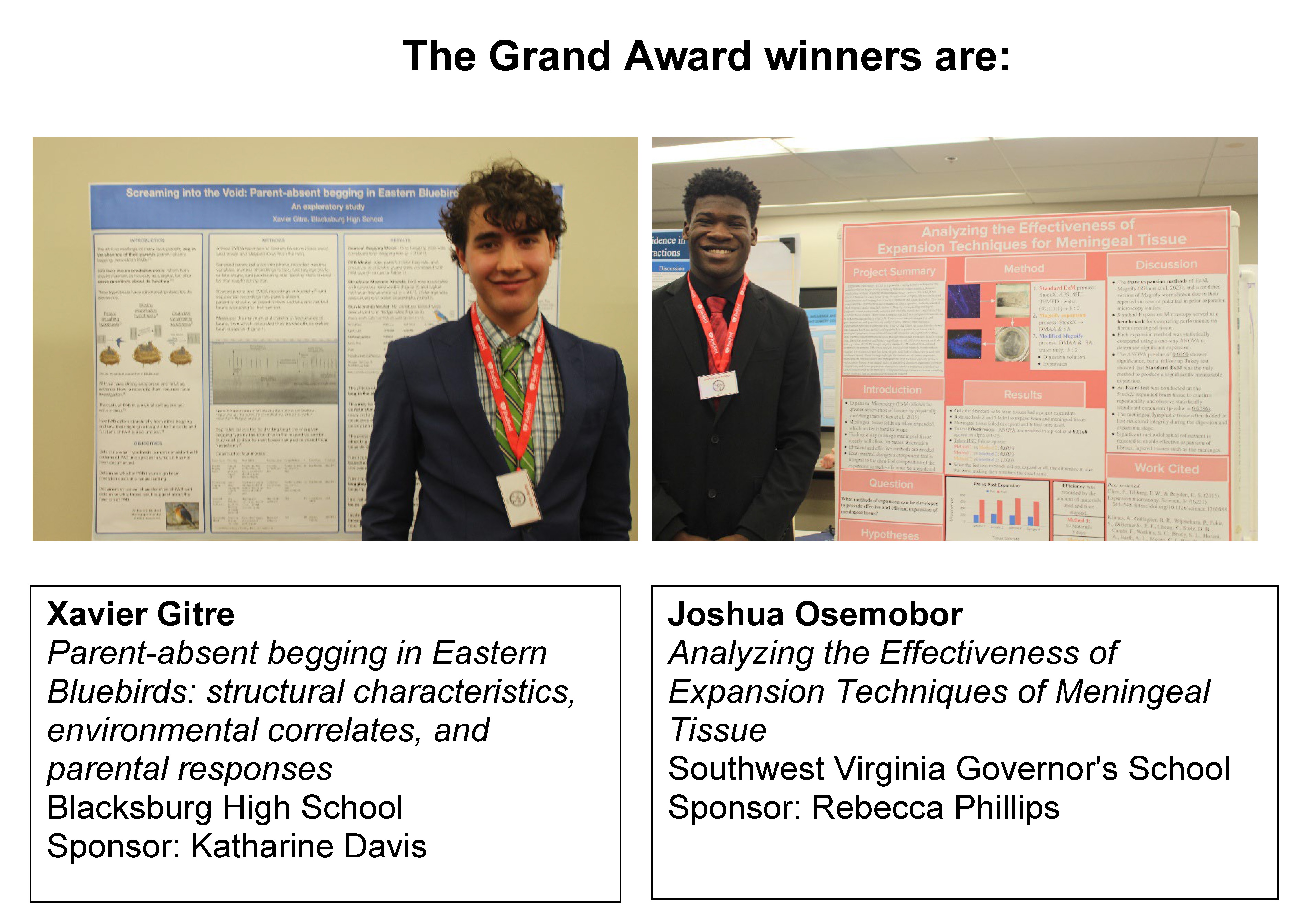 Christine Hermann and Dr. Kimberly Lane, The Grand Award and Grand Award Alternate winners of the 35th Blue Ridge Highlands Regional Science are listed below: